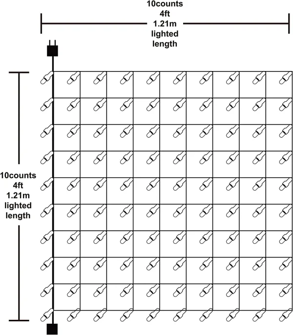 • Net Christmas lights feature 100 bright Warm White mini incandescent bulbs with green wires, spare bulbs, and fuses. Each set has a light area of 4 x 4 Feet. High Voltage.