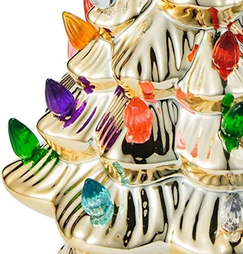 • With glossy gold ceramic and multicolored bulbs and a star topper, this desk tree looks gorgeous. Plus, 1 extra yellow star topper and 10 bulbs are included