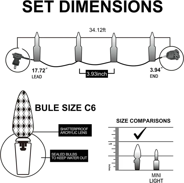 • LED string lights warm white come with 1 pack of 150-count Warm LED light strings. It measures around 50.52 FT with Green wire. whole Lighted Length coverage of 48.72 FT. Also equipped with a C6 bulb type for more efficient, bright, and energy-saving lighting. Our package provides 1 extra C6 bulb count for replacement.