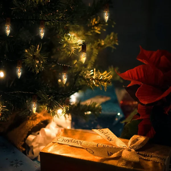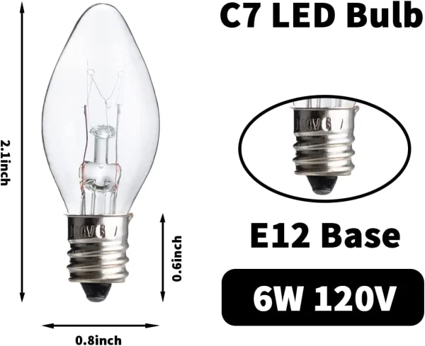 These C7 incandescent Christmas light bulbs are perfect for your home and also for the holidays. These Christmas string lights come with a Clear C7 Light Bulb set Bulk packed in a 25-piece box, clear replacement bulbs fit in C7/ E12 Candelabra screw bases, and 6-watt light bulbs glow a warm white. With durable insulated wire, our product could be used for a long time. Perfect for Indoor & Outdoor Use, like trees, windows, doors, stair railing, and the edge of the roof.