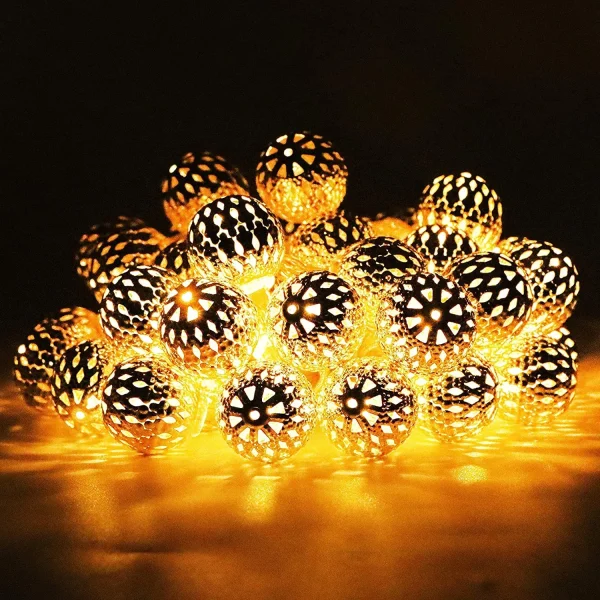 • The Moroccan String Lights features a unique hollow globe design with 40 LED warm white lighting. The string light is approx. 13.5 ft long. The set comes in 2 packs.