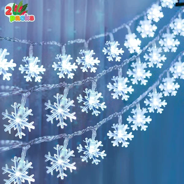 • This Snowflake String Lights set comes in 2 packs. The string light features a snowflake design with white light. Each string light measures 16ft and has 40 LED snowflakes. 2 Modes settings, steady and flash modes, create a unique atmosphere for fun.