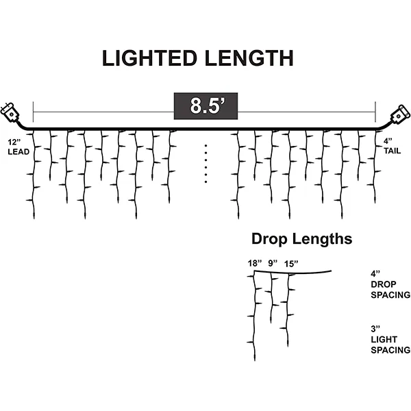 • Christmas icicle lights include 3 sets of 150 bright Warm White Incandescent bulbs with white wires, spare bulbs, and fuses. Each set has a lighted length of 8.5 Feet. High Voltage.
