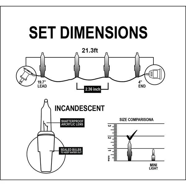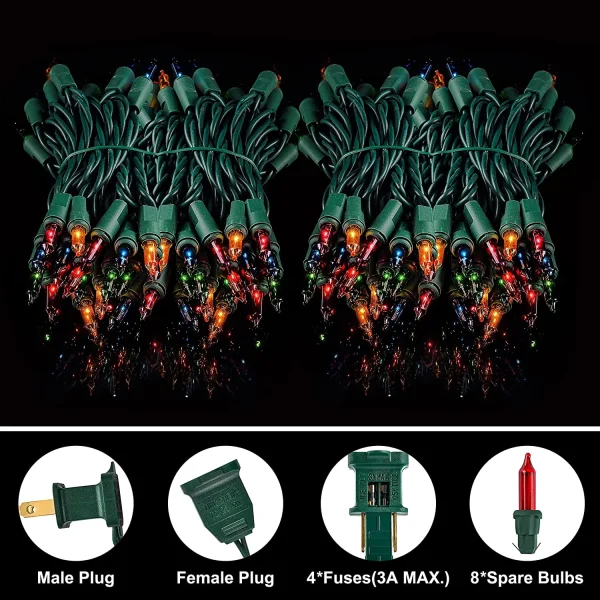 • Our Multicolor Led String Lights include 4 sets of colorful incandescent Christmas lights with 100-count lights. Each set is 21.3 feet long with 2.36-inch spacing. Conventional household power supply 120 volts 40.8 watts. 5 sets can be connected end to end. This comes with 8 extra bulbs and 4 fuses.