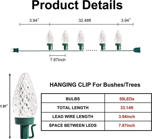- SUPER VALUE PACK. Our Christmas Lights set includes a 50-count Warm White LED string light. It measures around 33.14 FT with Green wire. whole Lighted Length coverage of 32.48 FT. Total length is 32.48 FT and 50 count.