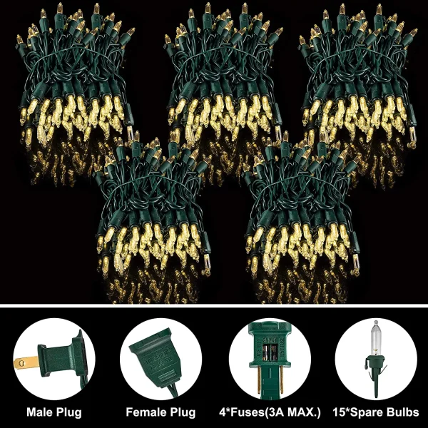 • Clear Christmas string lights to come with 5 Pcs clear LED Clear Christmas String Lights with 150 lights. Each set is 38.7 feet long. The end-to-end can be connected to 15 sets. You will also get 15 extra bulbs and 5 fuses.
