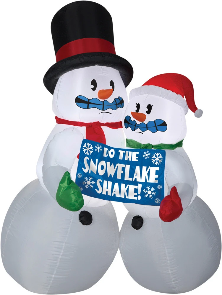 Animated Airblown Shivering Snow Couple is such a cute addition to your Christmas yard decor! Holding a funny banner saying, Do The Snowflake Shake! Airblown gives your decor maximum impact with minimum effort and it comes with everything you need for quick and easy set-up. You just stake it down and plug it in. Lights up with clear LED lights Self-inflates in seconds Deflates for easy storage Made of Fabric,70%; Plastic,20%; Metal,10%. Measures approximately 72 inches tall, 51 inches wide, and 59 inches deep.