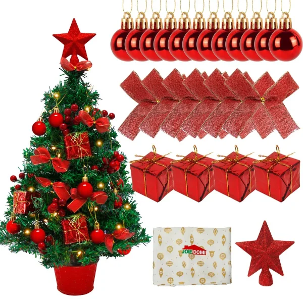 • Our Tabletop Christmas Tree includes 20 inches Battery Powered Tabletop Mini Christmas Tree with 50 LED warm white String Lights. This comes with One Treetop Star,12 red balls ornaments,4 small gift boxes,8 bunches of red berries,6 beautiful bows, and 1 sturdy red flowerpot. Build your own Xmas tree and bring yourself fun festive memory!