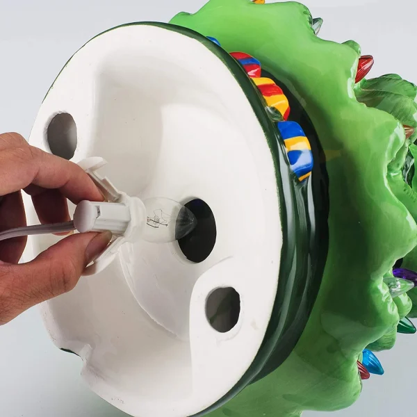 • Christmas tree body is made of Ceramic and comes with multicolored bulbs (C7) and Transparent Star Tree Topper, and gift boxes under the tree design. Also comes with one Extra Red Star Topper and 10 multicolored bulbs